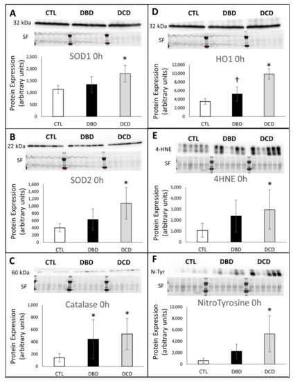 Western Blot evaluation of inflammation and oxidative stress markers: (A): SOD1, (B): SOD2, (C): Catalase, (D): HO-1, (E): 4-HNE, (F): NitroTyrosine. Frozen samples were collected at the indicated times and processes for western blot analysis. 30 µg protein were loaded for each lane. Each lane corresponds to the extract from 1 sample, at the indicated time. For each target, the signal is shown on top, with normalizing stain free blot (SF) shown underneath; quantification is shown at the bottom. CTL group: white bars; DBD group: black bars; DCD group: gray bars. Statistics: shown are mean ± SEM, multiple comparison tests were performed using ANOVA Kruskal Wallis + Dunns Test, *: p < 0.05 to CTL at the same time; †: p < 0.05 to DCD, at the same time. n = 5.