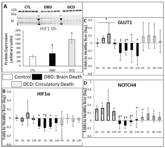 Western blot and RTqPCR evaluation of hypoxia markers: Frozen samples were collected at the indicated times and processes for western blot (A) and RTqPCR analysis (B–D). (A): Western Blot analysis of HIF-1α protein expression. Frozen samples were collected at the indicated times and processes for western blot analysis. 30 µg protein were loaded for each lane. Each lane corresponds to the extract from 1 sample, at the indicated time. The signal is shown on top, with normalizing stain free blot (SF) shown underneath; quantification is shown at the bottom. (B–D): mRNA expression levels of (B): HIF-1α, (C): GLUT1 and (D): Notch4. mRNA expression levels in the samples relative to expression in healthy control liver were determined with the Pfaffl method (expressed as Relative Fold Change), using ribosomal L19, β-Actin, SDHA, CYA62 and RPLPO genes as internal controls. Healthy livers were chosen as normalization in order to gauge alterations in the Control group. CTL group: white bars; DBD group: black bars; DCD group: gray bars. Statistics: shown are mean ± SEM, multiple comparison tests were performed using ANOVA Kruskal Wallis + Dunns Test, †: p < 0.05 within group; *: p < 0.05 to CTL at the same time; p < 0.05 ‡: to DCD, at the same time. n = 5.