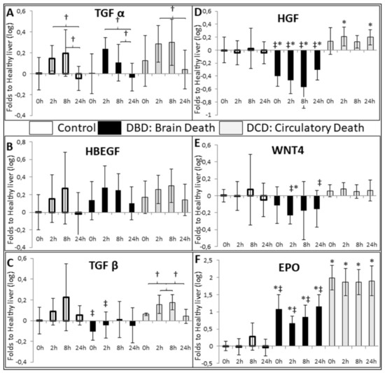 RTqPCR Evaluation of regeneration markers: Frozen samples were collected at the indicated times and processes for RTqPCR analysis. (A): TGFα, (B): HBEGF, (C): TGFβ, (D): HGF, (E): WNT4 and (F): EPO. mRNA expression levels in the samples relative to expression in healthy control liver were determined with the Pfaffl method (expressed as Relative Fold Change), using ribosomal L19, β-Actin, SDHA, CYA62 and RPLPO genes as internal controls. Healthy livers were chosen as normalization in order to gauge alterations in the Control group. CTL group: white bars; DBD group: black bars; DCD group: gray bars. Statistics: shown are mean ± SEM, multiple comparison tests were performed using ANOVA Kruskal Wallis + Dunns Test, †: p < 0.05 within group; *: p < 0.05 to CTL at the same time; p < 0.05 ‡: to DCD, at the same time. n = 5.