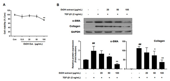 EtOH extract of R. palmatum inhibited the activation of LX-2 cells. (A) Cytotoxicity of EtOH extract of R. palmatum in LX-2 cells was measured by WST-1 assay. LX-2 cells were treated with EtOH extract of R. palmatum for 48 h after activation by TGF-β1 for 48 h. (B) The protein expression levels of α-smooth muscle actin (α–SMA) and collagen were analyzed by western blotting assay and quantified by Image J. Glyceraldehyde 3-phosphate dehydrogenase (GAPDH) was used as a loading control. Each experiment was repeated three times, and the values represent mean ± SD. ## p < 0.01 compared with the control, ** p < 0.01, * p < 0.05 compared with TGF-β1-treated cells.