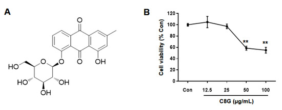 Cytotoxicity of chrysophanol 8-O-glucoside (C8G) in LX-2 cells. (A) Structure of C8G. (B) Cytotoxicity of C8G in LX-2 cells was assessed by WST-1 assay. LX-2 cells were treated with C8G for 48 h after activation by TGF-β1 for 48 h. Each experiment was repeated three times, and the values represent mean ± SD. ** p < 0.01 compared with TGF-β1-treated cells.