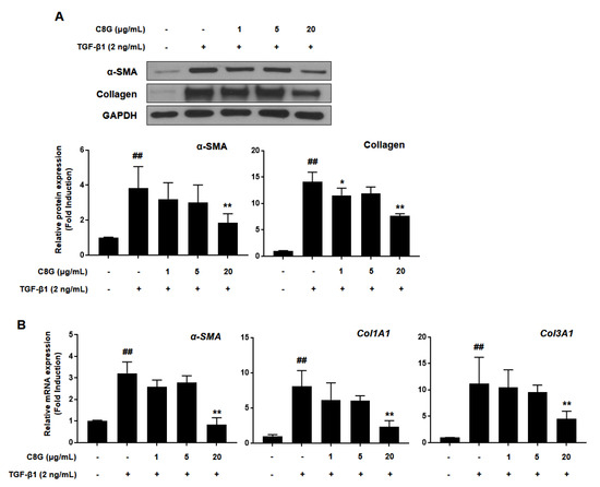Before the inhibitory effects of C8G on HSC activation were investigated, cytotoxicity was tested by WST-1 assay by measuring mitochondrial dehydrogenase activity (Figure 2B). C8G at concentrations of 50 μg/mL or higher significantly decreased cell viability; therefore, C8G at 0–20 μg/mL, which did not show cytotoxicity, was used in the subsequent test. To examine the inhibitory effects of C8G on HSC activation, the protein and mRNA expression levels of α-SMA and collagen were analyzed by western blotting and qPCR analyses. The protein expression of α-SMA and collagen significantly increased after TGF-β1 treatment; however, 20 μg/mL C8G significantly suppressed this increase (Figure 3A). Similarly, 20 μg/mL C8G strongly inhibited the mRNA expression of α-SMA, col1A1, and col3A1 induced by TGF-β1 treatment (Figure 3B).