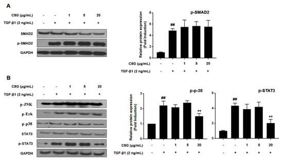 To investigate the mechanism by which C8G affected HSC activation, we analyzed the effect of C8G on the TGF-β/SMAD pathway, which is known to be associated with a canonical pathway for HSC activation by TGF-β1. TGF-β1 treatment significantly increased phosphorylated SMAD2; however, C8G did not suppress the expression of activated SMAD2 (Figure 4A). Next, we measured the levels of phosphorylated JNK (p-JNK), p-Erk, p-p38, and p-STAT3, which are proteins associated with the TGF-β non-canonical pathways of HSC activation. The results showed that the expression of p38 and p-STAT3 was significantly inhibited by C8G treatment; however, that of p-JNK and p-Erk was not reduced by C8G treatment (Figure 4B).