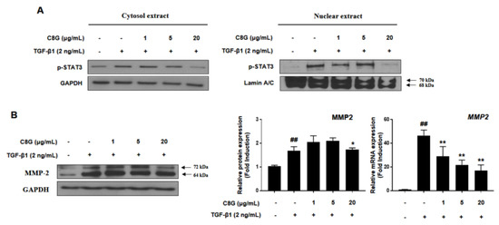 C8G inhibited nuclear translocation of p-STAT3. (A) The expression levels of p-STAT3 were analyzed from cytosolic and nuclear protein fraction. Lamin A/C was used as a cytosolic and nuclear loading control. (B) The protein and mRNA level of MMP2 was measured by qPCR and western blot analysis. Each experiment was conducted under the condition of present (+) or absence (−) of C8G and TGF-β1 and repeated three times and values represent mean ± SD. ## p < 0.01 compared with control, * p < 0.05, ** p < 0.01, compared with TGF-β1 treatment cells.