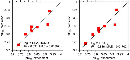 and are characterized by nearly the same values of mean absolute error of prediction (MAE equal to 0.01807 and 0.01702, respectively) and determination coefficients (R2 equal to 0.831 and 0.836, respectively). Figure 3 shows the comparison of the experimental pIC50 values with the associated predictions offered by the two above QSAR models. Both models indicate the significant contributions of both the magnitude of molecule lipophilicity and the number of hydrogen bond acceptors in its structure. The remaining pair of descriptors (EHOMO and χ) is mutually convoluted through the ELUMO value and strongly correlated (R = −0.987). Thus, their similar role as complementing parameter in the QSAR models is reasonable.