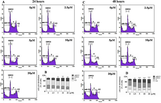 Effect of compound 3a on cell cycle distribution in the RPMI 8226 cell line. After the treatment with various concentrations of compound 3a for 24 and 48 h, the cells were stained with propidium iodide and analyzed by flow cytometry. Representative DNA histograms after 24-h (A) and 48-h (C) treatment. Statistical analysis of the percentages of cells in the sub-G1, G0/G1, S, and G2 phases after 24-h (B) and 48-h (D) treatment. Data (n = 6 for each concentration) are presented as the mean ± SD of three independent experiments; * p < 0.05, ** p < 0.01 and *** p < 0.001 in comparison to the control; one-way ANOVA test.