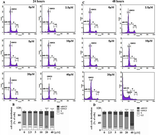 Effect of compound 3a on cell cycle distribution in the A549 cell line. After the treatment with various concentrations of compound 3a for 24 and 48 h, the cells were stained with propidium iodide and analyzed by flow cytometry. Representative DNA histograms after 24-h (A) and 48-h (C) treatment. Statistical analysis of the percentages of cells in the sub-G1, G0/G1, S, and G2 phases after 24-h (B) and 48-h (D) treatment. Data (n = 6 for each concentration) are presented as the mean ± SD of three independent experiments; * p < 0.05, ** p < 0.01 and *** p < 0.001 in comparison to the control; one-way ANOVA test.