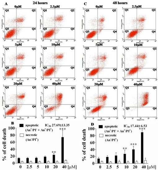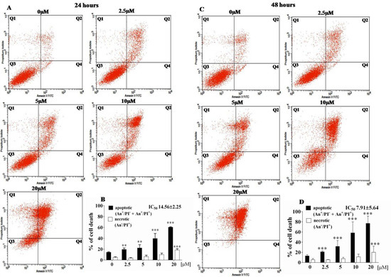 Effect of compound 3a on apoptosis/necrosis induction in the A549 cells. After the 24-h (A) and 48-h (C) exposure to the different concentrations of compound 3a, the cells were stained with Annexin (An) V-FITC/propidium iodide (PI) and examined with flow cytometry. Quadrant Q1 represents An−/PI+ necrotic cells, Q2—An+/PI+ late apoptotic cells, Q3—An−/PI− viable cells, Q4—An+/PI− early apoptotic cells. Histogram representation of the quantitative percentage of total apoptotic cells (early + late apoptosis) and necrotic cells in the control and compound 3a-treated cell cultures after the 24-h (B) and 48-h (D) treatment. All experiments were repeated independently at least three times, and data (n = 6 for each concentration) are expressed as mean ± SD; ** p < 0.01 and *** p < 0.001 in comparison to the control; one-way ANOVA test.