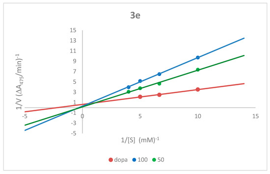 To understand the mechanism of mushroom tyrosinase inhibition by new compounds 3a–3h, enzyme inhibition kinetic studies were performed. The mechanism of tyrosinase inhibition was determined using Lineweaver–Burk plot, which is a useful graphical method for analysis of the Michaelis–Menten equations used to determine the inhibition constant KM. This graphical representation showed that compounds 3a–3h exhibited a mixed mechanism of tyrosinase inhibition, meaning that investigated molecules are able to bind to the enzyme even if it already bound other substrate (Figure 8).