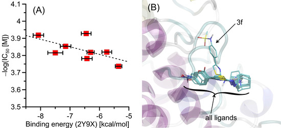 (A) The correlation between the binding energies calculated for 2y9x interacting with a set of ligand molecules (3a–3h and ascorbate ion) with the −log(IC50) values. The numerical values can be found in Table 4. (B) The superposition of poses of all ligands found during docking study. Compound 3f may exhibit the two alternative poses, only slightly differing by binding energies (see discussion in the text).