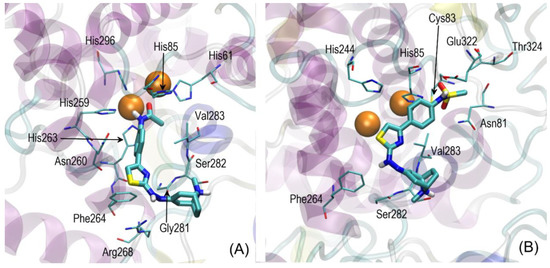 The individual interaction pattern exhibited by compound 3f is characterized by a larger distance between Cu ions and the −NHSO2Me group in comparison to previously discussed interactions involving –R substituent. Instead, the −NHSO2Me moiety interacts with Thr324, Glu322, and Asn81. The two latter contacts are maintained through the presence of hydrogen bonding whereas the former one speaks for the occurrence of weaker, hydrophobic interactions between methyl groups. Cys83, located close to −NHSO2Me does not seem to exhibit any specific types of interactions with ligand. At the same time, phenyl ring of the ligand interacts with His85 and His244 by the H-π stacking. Interestingly, the thiazole ring does not exhibit any close contacts with protein. The hydrazine moiety is located close to Phe264, which suggests the existence of the H-π interactions. Finally, the location of aliphatic moiety is stabilized by the contacts with hydrophobic sidechains of Val283 while its amine substituent creates hydrogen bonding with neighboring Ser282. Note that this binding pattern is closer to that observed in our previous study and described in [23] in comparison to the poses discussed above and corresponding to the remaining ligands.