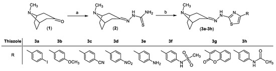 Synthesis of the target tropinone-thiazoles 3a–3h. (a) thiosemicarbazide, glacial acetic acid, EtOH, reflux, 24 h (65%); (b) 4-substituted-bromoacetophenones, EtOH, reflux, 24 h (26–50%).