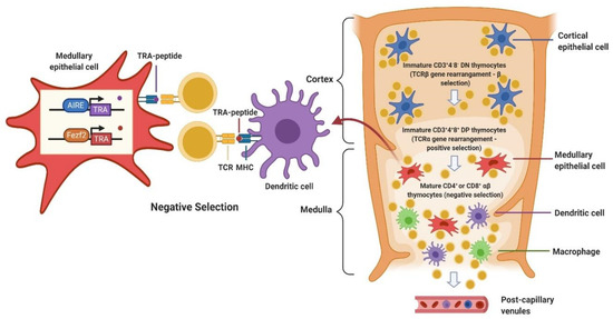 Thymic epithelial cells derive from the pharyngeal endoderm and are differentially organized in a loose net in the cortex, while they cluster in solid cordons in the medulla, as well as structures known as Hassall corpuscles. Lymphocytes, named “T-cells” after thymus, derive from thymocytes and are intermingled with epithelial cells [17]. T-cell progenitors move through the thymic structure and undergo several transformations as they differentiate in the thymus, before becoming mature T-cells (Figure 1). The most immature CD3+CD4-CD8- (double negatives, DN) thymocytes can differentiate in the cortex into CD3+CD4+CD8+ (double positive, DP) cells only after a process called β selection, that consists of rearrangement and expression of functional T-cell receptors (TCR) β chains [17,18]. DP thymocytes then rearrange the TCR α chain genes and express TCR-α/β, and undergo positive and negative selection. By positive selection, only those thymocytes that have a TCR capable of binding the Major Histocompatibility Complex (MHC) expressed on thymic epithelial cells are preserved. CD8 functions as a coreceptor to bind to MHC class I, while CD4 binds MHC class II. Only positively selected thymocytes polarize towards a persistent expression of either CD4 or CD8, depending on their specificity, and can mature into either CD4+ or CD8+ single positive (SP) T-cells. SP cells migrate in the medulla, where negative selection takes place: all autoreactive thymocytes binding with a high affinity to self-peptides presented on MHC I and MHC II are eliminated by apoptosis [17,18].