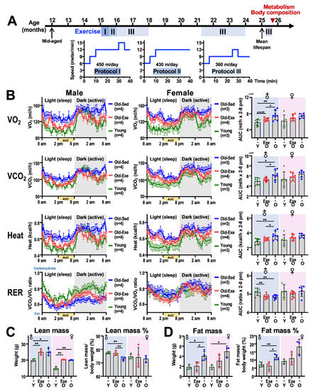 We sought to determine the impact of middle-to-old age regular exercise on energy metabolism in very old mice (>24 months, which is equivalent to >80 years old in human) [26]. We adopted a forced treadmill exercise protocol that has been shown to produce an overt effect on the cardiorespiratory and metabolic benefits similar to those observed in humans while exercising [27,28]. Male and female C57BL/6 mice at 15-month-old of age (equivalent to a 50-year-old in humans) were subjected to two cycles of 12-weeks forced treadmill exercise on a 5-on-2-off schedule. Mice were rested for three months before the initiation of a similar second cycle of 12-weeks exercise. The exercise intensity was reduced after the third week, and was further modified according to the physical performance of the mice on treadmill (Figure 1A). The energy metabolism of the exercise mice and the sedentary mice were monitored using a TSE metabolic cage system, and the metabolic parameters of 3-months old (i.e., young) mice that had never been on a treadmill were also measured as a comparison. Exercise did not seem to result in a significant impact on the oxygen consumption and CO2 production of the female mice. On the other hand, the effect of the animal’s circadian rhythm on oxygen consumption and heat production, when the dark and light hours of male mice are compared, appears to have a more prominent effect on the exercise group than the sedentary group (Figure 1B). In addition, the VO2 of exercised mice (i.e., Old-Exe) is closer to the young group than the sedentary mice (Old-Sed) when male mice were considered. On the other hand, the RER values of the male Old-Exe group are higher than the male Old-Sed group during the active hours; however this observation was not seen for the female mice (Figure 1B). These findings suggest that regular exercise is able to prompt the male mouse body to use carbohydrates as a fuel source during the active hours, but this phenomenon does not seem to occur in female mice.