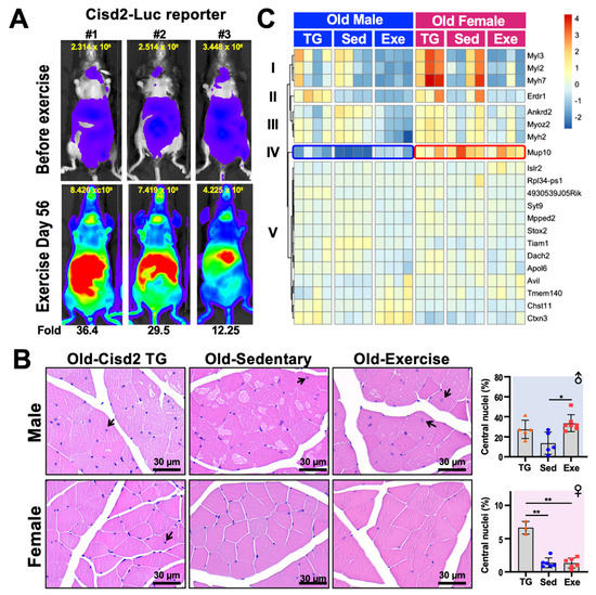 Figure 2. Histology and transcription analysis of femoris muscle from mice that have practiced long-term exercise. (A) Luciferase activity in Cisd2-Luc reporter mice before and after 56-days of treadmill exercise. The treadmill protocol was 6 m/min for 5 min, 9 m/min for 5 min, 12 m/min for 20 min, 15 m/day for 5 min and 12 m/day for 5 min, for a total of 450 m/day. The Cisd2-Luc reporter mice ran on treadmills at a frequency of 5 days/week for 8 weeks (56 days). The quantification of luciferase intensity in each of the mice in the figure is shown at top of each image. Increased (fold change) Cisd2-Luc luciferase signals are numbered below the images; these represent mice after the exercise was completed. The photos were taken ventrally. (B) H&E staining of the femoris muscles of Cisd2-TG, Old-Sed and Old-Exe male and female mice. The arrows indicate myofibers that contain central nuclei. Bars: 30 μm. Percentage of central nucleation in each group of mice is presented on the right. The data are presented as means ± SD. Statistical analysis used the Student’s t-test. *, p < 0.05; **, p < 0.01. TG, Cisd2-TG; Sed, sedentary; Exe, exercise. (C) A heatmap showed the differentially expressed gene (RNA-Seq) clusters for the male and female femoris muscle that have been changed by long-term treadmill exercise. The RNA-seq data was analyzed by “DEseq2” and the DE genes were defined as LFC > 0.14 and FDR < 0.1. The heatmap was generated using the “pheatmap” R package (Raivo Kolde (2019). pheatmap: Pretty Heatmaps. R package version 1.0.12. https://CRAN.R-project.org/package=pheatmap) according to rlog transformed count calculated by “DEseq2”.