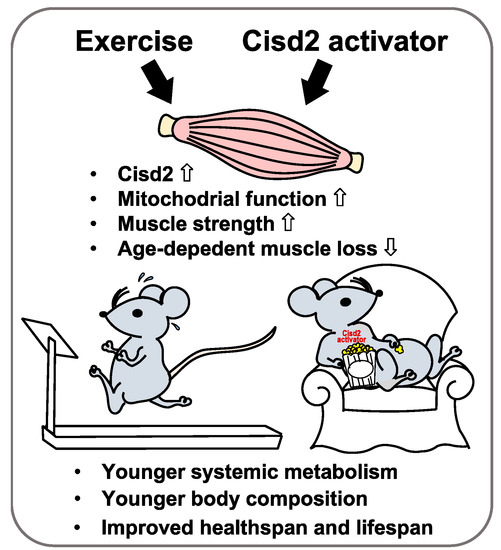 75. Wu, C.-Y.; Chen, Y.-F.; Wang, C.-H.; Kao, C.-H.; Zhuang, H.-W.; Chen, C.-C.; Chen, L.-K.; Kirby, R.; Wei, Y.-H.; Tsai, S.-F.; et al. A persistent level of Cisd2 extends healthy lifespan and delays aging in mice. Hum. Mol. Genet. 2012, 21, 3956–3968. [Google Scholar] [CrossRef] [PubMed]