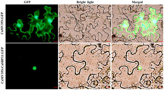 The coding region of CaSBP11 without its termination codon was amplified and cloned into a pVBG2307: GFP vector (which contains a CaMV35S promoter that comes from PBI121 [63] and a GFP gene) between the BamHI and SmaI restriction sites to yield the final pVBG2307:CaSBP11:GFP plasmid (Supplementary Materials, Table S1) The recombinant fusion pVBG2307:CaSBP11:GFP plasmid was confirmed by sequencing performed by Sangon-Biotech Company (Shanghai, China). Then, the recombined vector (pVBG2307:CaSBP11:GFP) was transformed into the Agrobacterium tumefaciens strain GV3101 via the freeze-thaw method. Next, GV3101 cells carrying the pVBG2307:CaSBP11:GFP (CaMV35S:CaSBP11:GFP) and pVBG2307:GFP (CaMV35S:GFP) constructs were cultured overnight in Luria-Bertani (LB) medium with the appropriate antibiotics. Then, a prepared buffer (10 mM MES, pH 5.7, 10 mM MgCl2 and 200 μm acetosyringone) was used to create a cell suspension. The cell suspension (OD = 0.8) was then injected into the leaves of N. benthamiana with a needless syringe [64]. After injection, the plants were first cultured in darkness at 22 °C for 12 h and then cultured at 22/18 °C (day/night temperature) with a 16-h photoperiod for two days. After that, a fluorescent confocal microscope (Olympus, Tokyo, Japan) with a 488 nm excitation wavelength was used to detect green fluorescence.