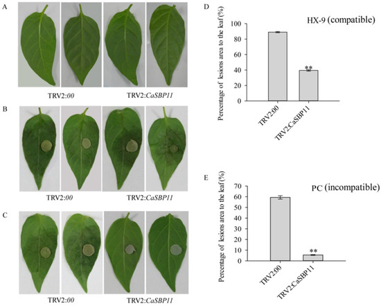 To further study the role of CaSBP11 in the defense response of pepper plants to P. capsici infection, CaSBP11 was silenced. In this study, CaPDS (phytoene desaturase, GenBank accession number, X68058), which induces a leaf photo-bleaching phenotype when silenced, was selected as a positive control. Additionally, the empty TRV2:00 vector was selected as a negative control. Forty days after injection, the positive control plants showed photo-bleaching, while the TRV2:00 and the CaSBP11-silenced plants exhibited no obvious phenotypic changes (Supplementary Materials, Figure S1A). Subsequently, the silencing efficiency of CaSBP11 was checked by qPCR. As shown in Supplementary Materials, Figure S1B, the silencing efficiency of CaSBP11 was 82.3%. Then, the disease resistance of CaSBP11-silenced plants was assessed. After 3 days in culture conditions without P. capsici inoculation, there was no obvious phenotypic difference between the detached leaves of CaSBP11-silenced plants and negative control plants (Figure 2A). However, 3 days after inoculation with compatible P. capsici (HX-9), the detached leaves of CaSBP11-silenced plants appeared to develop hygrophanous lesions, with lesion areas significantly smaller than that of the negative control leaves (Figure 2B,D). Moreover, 3 days after inoculation with incompatible P. capsici (PC), the area of diseased leaves of CaSBP11-silenced plants was significantly smaller than that of the negative control plants (Figure 2C,E). In addition, 3 days after inoculation with compatible P. capsici (HX-9), the lesion area of CaSBP11-silenced plants and negative control plants were larger than those inoculated with incompatible P. capsici (PC) (Figure 2).