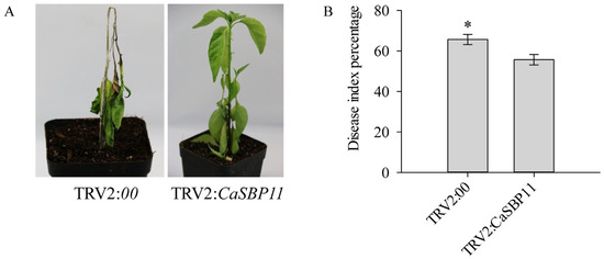 Sixteen days after inoculation with P. capsici (HX-9, the lower leaves of the CaSBP11-silenced plants wilted and the stem base turned black (Figure 3A). However, the leaves in the lower layer of the negative control plants dropped off, the stem base became black and the entire plant wilted (Figure 3A). The disease phenotypes of CaSBP11-silenced and control plants were categorized into five different levels (level 0, no symptoms; level 1, the lower leaves of the plant turn yellow or wilt; level 2, the lower leaves of the plant exhibit an obvious deciduous phenomenon or the whole plant is wilted; level 3, blackening of stem base and all leaves have fallen off except at growth points; level 4, the whole plant is dead. Supplementary Materials, Figure S2). Then, the disease phenotypes of CaSBP11-silenced and control plants were quantified. As shown in Figure 3B, the disease index percentage of negative control plants was significantly higher than that of the CaSBP11-silenced plants. These results indicate that CaSBP11 silencing enhanced pepper resistance to P. capsici infection.