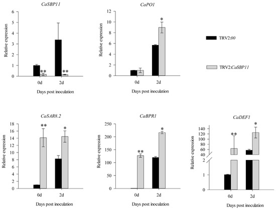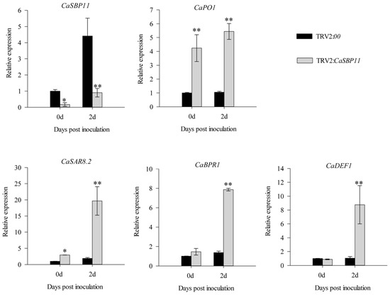 The expression of defense-related genes after inoculation with compatible P. capsici (HX-9) in CaSBP11-silenced and negative control plants. In this experiment, roots from CaSBP11-silenced and negative control plants were collected at 0 days (collected at the time of inoculation) and 2 days, for the detection of defense-related genes. The means were analyzed using the least significant difference (LSD). * and ** represent significant differences at p < 0.05 and p < 0.01 respectively. Mean values and SDs for three replicates are shown.