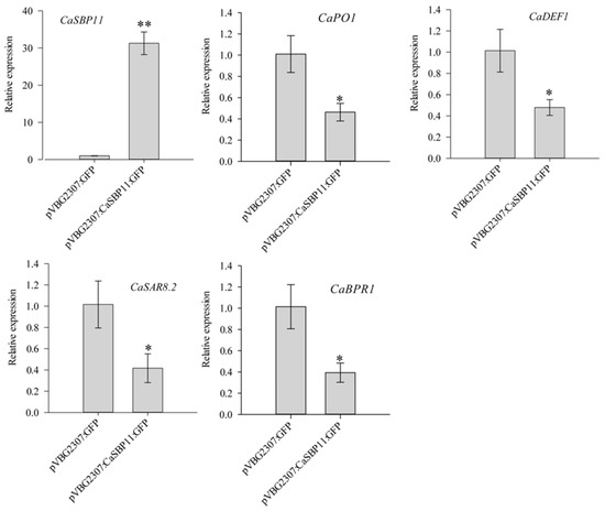 In the above results, it was found that the expression of the defense-related genes CaPO1, CaSAR8.2, CaBPR1 and CaDEF1 was increased in CaSBP11-silenced plants. Thus, we speculated that CaSBP11 may inhibit the expression of these defense-related genes. To test this hypothesis, CaSBP11 was transiently expressed in pepper. In this experiment, leaves were collected after Agrobacterium (carrying the pVBG2307:CaSBP11:GFP and pVBG2307:GFP constructs) infection two days for the detection of gene expression. As shown in Figure 6, CaSBP11 was successfully transiently expressed in pepper plants and its expression level in transient expression plants (transformed with hpVBG2307:CaSBP11:GFP constructs) was significantly higher than that in control plants (pVBG2307:GFP). In addition, the expression levels of the defense-related genes CaPO1, CaSAR8.2, CaBPR1 and CaDEF1 in plants transiently expressing CaSBP11 were significantly lower than those in control plants. These results indicate that CaSBP11 negatively regulates the expression of defense-related genes. Thus, we speculated that CaSBP11 is a negative regulator of plant immunity.