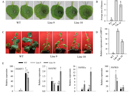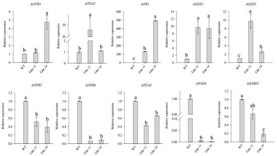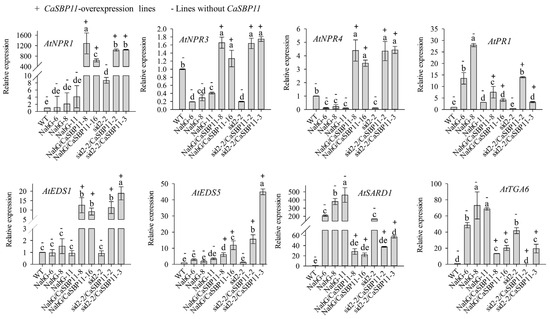 Expression of genes related to the salicylic acid signaling pathways in the CaSBP11 transgenic lines of Arabidopsis. The means were analyzed using the least significant difference (LSD). Different small letters (a, ab, b, c) represent significant differences as determined by the LSD test (p < 0.05). Mean values and SDs for three replicates are shown.