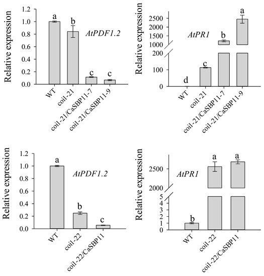 Furthermore, the expression levels of jasmonic acid signaling pathway-related genes in coi1-21 and coi1-22 lines and CaSBP11 overexpressing in coi1-21 (coi1-21/CaSBP11-7 and coi1-21/CaSBP11-9) and coi1-22 lines (coi1-22/CaSBP11) were detected. As shown in Figure 10, the expression of AtPDF1.2 in coi1-21 and coi1-22 lines decreased compared with that in WT lines. The expression of AtPR1 in coi1-21 and coi1-22 lines was higher than that in WT lines (Figure 10). In addition, the expression level of AtPDF1.2 in CaSBP11-overexpressing in coi1-21 and coi1-22 lines was decreased compared with that in coi1-21 and coi1-22 lines (Figure 10). The expression level of AtPR1 in CaSBP11-overexpressing coi1-21 and coi1-22 lines was higher than that in coi1-21 and coi1-22 lines (Figure 10). These results indicated that CaSBP11 may be involved in the salicylic acid-and jasmonic acid-mediated disease resistance signaling pathways.