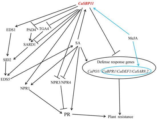 Proposed model for CaSBP11 participating in plant defense response. Arrows indicate positive regulation, while those without arrows indicate negative regulation. The genes that are not marked Ca are expected to exist in pepper as homologues of those in Arabidopsis. CaPO1: Pepper peroxidase-like gene; CaBPR1: Pepper pathogenesis-related (PR)-1 protein; CaDEF1: Pepper defensin gene; CaSAR8.2: Systemic acquired resistance gene; EDS1: alpha/beta-Hydrolases superfamily protein; PAD4: Phytoalexin deficient 4; TGA4: TGACG motif-binding factor 4; SARD1: systemic acquired resistance deficient 1; SID2-2: Salicylic acid induction deficient 2; EDS5: MATE efflux family protein; NPR1: non-expressor of PR genes 1; NPR3: NPR1-like protein 3; NPR4:NPR1-like protein 4; PR: Pathogenesis-related gene.