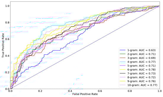 Hyperparameter optimization plays a very important role in achieving high-quality models in most machine learning and deep learning tasks (e.g., in [,]). Since our model was created by combining different algorithms from NLP, machine learning, and deep learning, we also performed pre-experiments on our data to find the optimal parameters of each model. Here, a five-fold cross validation training was also applied to perform this hyperparameter optimization on D1 dataset. First, to deal with fastText, we defined different combined sets from potential hyperparameters that could have reached the best performance. Some tuning parameters were ranged as follows: the number of epochs was from 0 to 500 (step size = 25), the learning rate was from 0.05 to 0.5 (step size = 0.05), wordNgram was from 1 to 10 (step size = 1), and there were three different types of loss functions (ns, hs, and softmax). The other parameters were gathered from previous research [] on a similar type of fastText applied to DNA sequences (dim = 100, ws = 5). After re-checking all the potential parameters, we found that the most important factor that could affect our model’s performance was the number of sub-word n-grams, as shown in Figure 1. As illustrated in this figure, the performance of the 6 g level slightly outperformed other levels, so we selected 6 g as our optimal n-gram and applied it to further experiments. The other parameters were an epoch of 200, a learning rate of 0.1, and the softmax loss function.