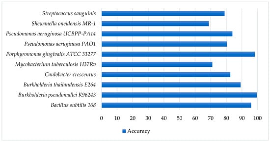 As shown in the study of Liu et al. [], it was important to evaluate our model on multiple species to generalize our study. Therefore, we also tested the performance of our model on a variety of datasets with different species (D4). In detail, we retrieved the essential genes of 53 diverse bacteria species from DEG [], which is a large database of essential genes. The validation range was larger than the previous study [] that had validated on 31 species. Figure 2 shows the predictive accuracies among representative species, and it can be observed that our model performed well on most of the species. There are some species that achieved especially high accuracies such as Bacillus subtilis 168 (95.9%), Porphyromonas gingivalis ATCC 33277 (98.27%), Burkholderia pseudomallei K96243 (99.6%), Pseudomonas aeruginosa PAO1 (99.4%), and Agrobacterium fabrum str. C58 (90.3%). Detailed information and predictive accuracy on all species are shown in Supplementary Table S2. We also compared our performance results to a previous study [] to understand the efficiency of the two models on different species datasets. As shown in Supplementary Table S2, our model was superior to the previous work in terms of the predictive accuracy of essential genes. We also improved the performance for some species that reached a low accuracy in previous work such as Mycobacterium tuberculosis H37Rv (71%), Pseudomonas aeruginosa UCBPP-PA14 (83.88%), Salmonella enterica subsp. enterica serovar Typhimurium str. 14028S (53.33%), and Salmonella typhimurium LT2 (51.3%). Our results also suggested that the hyperparameter optimization learned from gridCV for one species is transferable to other species with acceptable performance. Though there were few datasets that had a weak performance, the large number of high-performance datasets showed the significance of our model in identifying essential genes over multiple species. Future studies could be conducted to create a model to help to improve the predictive performance of all cross-species datasets.