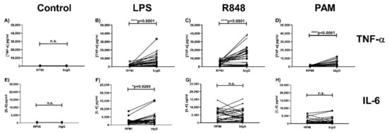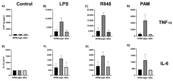 Figure 1A,E show that, when the cells were not stimulated with TLR ligands (control), TNF- α and IL-6 production levels were below the detection level. This was the case for both the trained and non-trained monocytes. Preincubation with bIgG led to increased production of TNF-α and, to a lesser extent, of IL-6 after restimulation with all three TLR ligands (Figure 1B–D,F–H). BSA, as a protein control, did not enhance TNF-α or IL-6 compared to the control. β-glucan that was also used as a positive control, as previously reported by others [13,30,31], only slightly enhanced the production of IL-6 but not of TNF-α (not shown), confirming our own earlier findings [10].