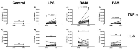 Figure 3A,E show that training with SPC resulted in a significantly higher production of TNF- α, but not IL-6, compared to the RPMI control condition after re-stimulation with LPS (TLR4 ligand) (Figure 3B,F), R848 (TLR7/8 ligand (Figure 3C,G), and Pam3CSK4 (TLR2/TLR1 ligand) (Figure 3D,H), indicating that SPC was also able to induce trained immunity in monocytes. The data per single donor compared to bIgG and SPC are shown in Figure S1.