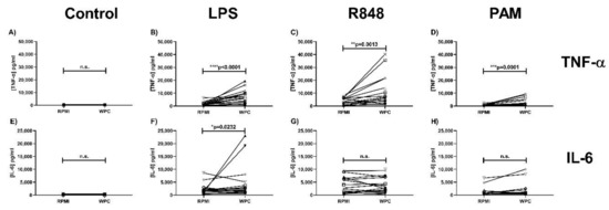Likewise, WPC also resulted in a significantly higher TNF-α production compared to the RPMI control condition after re-stimulation with LPS (TLR4 ligand) (Figure 4B), R848 (TLR7/8 ligand) (Figure 4C), and Pam3CSK4 (TLR2/TLR1 ligand) (Figure 4D). Furthermore, a significantly increased IL-6 production by WPC-trained monocytes compared to the RPMI control condition was measured after re-stimulation with LPS (TLR4 ligand) (Figure 4F), but not after re-stimulation with R848 (TLR7/8 ligand) or Pam3CSK4 (TLR2/TLR1 ligand) (Figure 4G,H). Taken together, similar to bIgG, both SPC and WPC were able to induce trained immunity in monocytes.