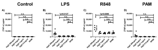 In order to reproduce the previous finding that bIgG can induce trained immunity, monocytes were isolated from buffy coats, allowed to adhere to the culture plates, and incubated with bIgG, and bovine serum albumin (BSA) as a protein control. After a five-day resting period, the cells were stimulated with the TLR ligands LPS (TLR-4 ligand), R848 (TLR-7 ligand), and Pam3CSK4 (TLR2/TLR1 ligand).