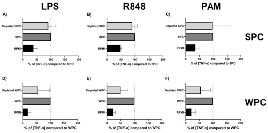 Effect of depletion of bIgG from SPC and WPC on the induction of trained immunity in primary monocytes. Monocytes were isolated from fresh buffy coats and after allowing the monocytes to adhere for 2 h, the training stimuli depleted SPC (diluted to the dilution corresponding to 200 µg bIgG/mL non-depleted SPC) and depleted WPC (diluted eq. to 200 µg bIgG/mL non-depleted WPC) and the negative control RPMI were added. After 24-h incubation with the stimulus, the monocytes were washed to remove the stimuli. On day 6, the monocytes were re-stimulated with (A,D) LPS (100 ng/mL), (B,E) R848 (10 µg/mL), or (C,F) PAM (Pam3CSK4, 10 µg/mL). After 24-h incubation, the supernatant was collected and TNF-α production was measured. Data are shown as % TNF-α production relative to the non-depleted SPC and WPC. Error bars represent the standard deviation.