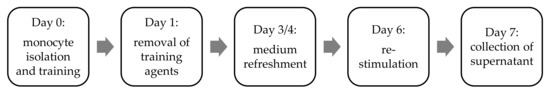 Human primary monocytes were taken up in RPMI 1640 medium (ThermoFisher, cat. #A1049101), supplemented with 1% pen/strep, to a concentration of 10^6 monocytes/mL and added to a 100 µL/well 96-well plate (Corning, cat. #3585). The monocytes were incubated for 2 h at 37 °C 5% CO2 to let the monocytes adhere to the bottom of the well. After 2 h, 100 µL/well warm 2× concentrated training agents was added to the monocytes. The monocytes were incubated with the training agents for 24 h at 37 °C 5% CO2. After 24 h of training, the training agents were removed by washing with warm DPBS and subsequently with warm DPBS 2% FBS. Then, warm RPMI, supplemented with 1% pen/strep mix and 10% human pooled serum, was added to the monocytes. After two or three days, the medium was refreshed with warm RPMI, supplemented with 1% pen/strep mix and 10% human pooled serum (Sigma Aldrich, cat. #H3667). On day 6, the cells were re-stimulated by different TLR ligands: Pam3CSK4 (1 µg/mL) (Invivogen, San Diego, CA, USA, cat. #tlrl-pms), LPS (0.1 µg/mL) (Sigma Aldrich, cat. #L6529), and R848 (10 µg/mL) (Invivogen, tlrl-r848), targeting TLR2/1, TLR4, and TLR7/8, respectively. RPMI, supplemented with 1% pen/strep, was included as a negative control for re-stimulation. The cells were incubated for 24 h at 37 °C 5% CO2. After 24 h, the supernatant was collected and stored at −20 °C for the IL-6 and TNF-α concentration measurement.