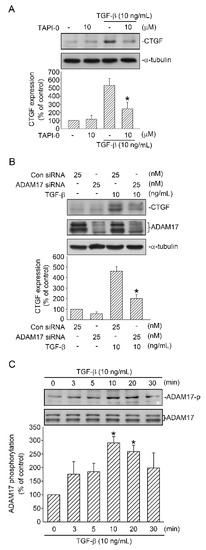 ADAM17 participates in several pathways, including the TGF-β signaling pathway, and contributes to tissue fibrosis [7,8]. To determine whether ADAM17 mediates TGF-β-induced CTGF expression, an ADAM17 inhibitor (TAPI-0) was used. TAPI-0 can also inhibit matrix metalloprotease (MMP). Treatment of cells with TAPI-0 (10 µM) inhibited TGF-β-induced CTGF expression by 70.4% ± 18.3% (Figure 2A). In addition, when ADAM17 siRNA (25 nM) was used for a specific knockdown, ADAM17 siRNA attenuated TGF-β-induced CTGF expression by 60.1% ± 10.4% (Figure 2B). Furthermore, ADAM17 siRNA markedly inhibited ADAM17 protein expression (Figure 2B). We further investigated whether TGF-β induced ADAM17 activation. Phosphorylation of the ADAM17 Thr735 residue enhances cell surface presentation and the stability and activity of ADAM17 [21], and phosphorylated ADAM17 Thr735-specific antibody was used to investigate the phosphorylation of ADAM17. Stimulation of A549 cells with TGF-β (10 ng/mL) in a time-dependent manner induced an increase in ADAM17 Thr735 phosphorylation, and the peak response was achieved at 10 min (Figure 2C). These results indicated that ADAM17 was a downstream molecule of the TGF-β signaling pathway and regulated TGF-β-induced CTGF expression in A549 cells.