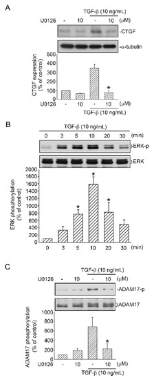 2.3. Mediating Effects of ERK on TGF-β-Induced CTGF Expression and ADAM17 Phosphorylation