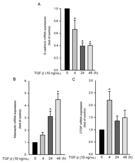 TGF-β-induced change in EMT-related mRNA levels in human lung epithelial A549 cells. (A) Cells were stimulated with TGF-β (10 ng/mL) for 0–48 h. Total RNA was isolated and E-cadherin mRNA was determined using qRT-PCR. Results are presented as mean ± SEM of three independent experiments. (B) Cells were stimulated with TGF-β (10 ng/mL) for 0–48 h. Total RNA was isolated, and FN mRNA was determined through qRT-PCR. Data are presented as mean ± SEM of three independent experiments. * p < 0.05, compared with the control group without TGF-β treatment. (C) Cells were stimulated with TGF-β (10 ng/mL) for 0–48 h. Total RNA was isolated, and CTGF mRNA was determined through qRT-PCR. Results are presented as mean ± SEM of seven independent experiments.