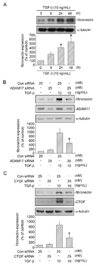 Involvement of ADAM17 and CTGF in TGF-β-induced FN expression in human lung epithelial A549 cells. (A) A549 cells were stimulated with TGF-β (10 ng/mL) for 0–48 h. FN and α-tubulin levels were detected in cell lysates through Western blotting. Data are presented as mean ± SEM of three independent experiments. * p < 0.05, compared with the control group without TGF-β treatment. (B) A549 cells were transfected with control siRNA (con siRNA) and ADAM17 siRNA (25 nM). After 24 h, the cells were stimulated with TGF-β (10 ng/mL) for an additional 48 h. FN and α-tubulin levels were detected through Western blotting. Results are presented as mean ± SEM of three independent experiments. * p < 0.05, compared with TGF-β plus the control siRNA group. (C) Cells were transfected with control siRNA (con siRNA) and CTGF siRNA (25 nM). After 24 h, the cells were stimulated with TGF-β (10 ng/mL) for an additional 48 h. FN and α-tubulin levels were detected through Western blotting. Results are presented as mean ± SEM of three independent experiments. * p < 0.05, compared with TGF-β plus the control siRNA group.