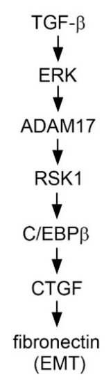 Chiou et al. (2006) suggested that the CTGF proximal promoter sequence included TATAA box, putative AP-1, C/EBPα, and C/EBPβ binding sites [17]. In addition, the promoter of the human collagen I gene has a binding site for C/EBPβ. Collagen I is recognized as a crucial mediator for TGF-β- and CTGF-induced fibrogenic processes [38]. However, the role of C/EBPβ in TGF-β-induced CTGF expression remains unclear. In the present study, we found that C/EBPβ markedly bound to the CTGF promoter upon TGF-β stimulation. Furthermore, when the cells were transfected with C/EBPβ siRNA, TGF-β-induced CTGF expression was inhibited, demonstrating that C/EBPβ exerted a positive modulation on TGF-β-induced CTGF expression. We also found that treatment with U0126, ADAM17 siRNA, and RSK1 siRNA inhibited C/EBPβ phosphorylation, suggesting that TGF-β induced C/EBPβ activation through the ERK/ADAM17/RSK1 pathway. Furthermore, the results of our study indicated that ADAM17 played a master role in TGF-β-induced CTGF expression and EMT through the ERK/RSK1/C/EBPβ pathway. In conclusion, TGF-β activated the ERK/ADAM17/RSK1/C/EBPβ signaling pathway, after which it promoted the connection of C/EBPβ to the C/EBPβ site on the CTGF promoter region to regulate CTGF expression in human lung epithelial cells. Moreover, ADAM17 and CTGF participated in TGF-β-induced FN expression. Our results reveal a signaling pathway related to ADAM17, CTGF, and FN and can be used to interpret how TGF-β induces the expression of CTGF and EMT, which may provide a new orientation for the treatment of IPF (Figure 9).