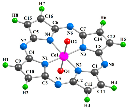 As is known, cobalt in its currently known chemical compounds can be in oxidation states from 0 up to V, wherein its highest oxidation state, namely IV and V, are uncharacteristic for the given element [1,2,3]. In particular, such compounds as CoO2 dioxide and cesium hexafluorocobaltate(IV) Cs2CoF6 [4,5], have been known for Co(IV) for a long time and for Co(V), sodium tetraoxocobaltates(V) Na3CoO4 and potassium K3CoO4 [6,7], and also a number of organometallic complexes [3,8,9,10]. An availability of Co(VI) was supposed in the matrix of cesium tetraoxoferrate(VI) (Cs2FeO4) as isomorphically replacing Fe(VI), and its identification was carried out by Mössbauer spectroscopy [11]; however, any compound with a stoichiometric chemical composition for a given oxidation state of cobalt was described neither in this work nor in other publications. By taking into account the theoretical considerations expressed in the introduction to the articles [12,13] devoted to Cu(IV) and Zn(IV) complexes with porphyrazine and its benzo-derivatives (in particular, trans-di[benzo]porphyrazine and tetra[benzo]porphyrazine) and one oxo ligand, we have every reason to believe that the given macrocyclic ligands in combination with two oxo ligands will also be able to form complexes with structural formulas [CoL1(O)2] (I), [CoL2(O)2] (II) and [CoL3(O)2] (III) (where L12−, L22− and L32− are double deprotonated forms of porphyrazine H2L1, trans-di[benzo]porphyrazine H2L2 and tetra[benzo]porphyrazine H2L3). These complexes are interesting in that, as it is easy to see from these formulas, in any of these complexes the cobalt atom is bonded to other atoms by eight chemical bonds, six of which are formed by the exchange mechanism (namely, two with each of two oxygen atoms and one with the each of two nitrogen atoms), and according to the generally accepted definition, the concept of “oxidation state”, the value of this parameter for a given atom of a 3d-element should be accepted equal to (+6). It should be specially noted that no mention of complexes of type I–III in the special literature devoted to (NNNN)-donor atomic macrocyclic ligands—porphyrins, porphyrazines and their derivatives [14,15,16,17,18,19,20,21,22], or anywhere else, could not be found. In this connection, the given article will be devoted to a theoretical analysis regarding the possibility of the existence in principle of such complexes with the use of modern methods of quantum chemistry, namely, the density functional theory (DFT) method.