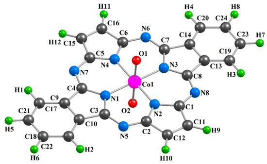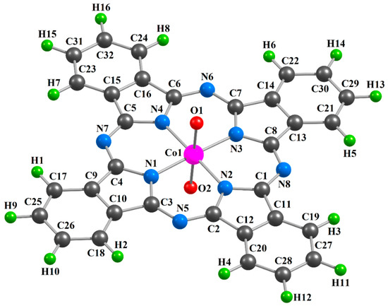 The bond lengths and bond angles listed above in [CoL1(O)2], [CoL2(O)2], and [CoL3(O)2] are quite typical for coordination compounds of 3d-elements containing L12−, L22−, and L32− as ligands (see, e.g., Supplementary Materials). It should be noted in this connection that within the framework of any of these structures, there are bonds between cobalt and oxygen atoms, the lengths of which (169–179 pm) correspond to double Co=O bonds, and bonds between cobalt and nitrogen atoms, the lengths of which (192–196 pm) correspond to a single Co–N bond. Note in this regard that the lengths of cobalt–nitrogen, carbon–nitrogen, and carbon–carbon bonds, as well as bond angles in the CoN4 chelate node and in metal chelate rings in the most bulky structures of these three complexes, namely [CoL3(O)2], are very close to the experimental values of the corresponding parameters for the complex of cobalt(II) with tetra [benzo]porphyrazine (phthalocyanine) [CoL3] found in [23,24].