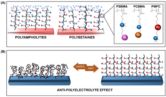 Schematic representation of the (A) zwitterionic polymers (ZPs) and (B) the salt-responsive antipolyelectrolyte effect (APE) of the ZP brushes. PSBMA—poly (sulfobetaine methacrylate), PCBMA—poly (carboxybetaine methacrylate), and PMPC—poly (2-methacryloyloxyethyl phosphorylcholine).