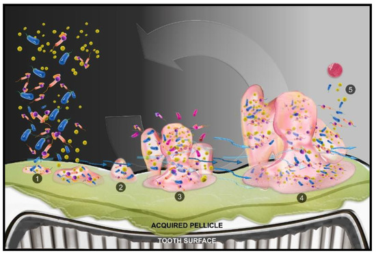 The development of oral biofilms is a spatiotemporal phenomenon that is composed of initial, physicochemical interactions. This initial contact establishes the foundation for the biofilm’s growth and maturation, incorporating a nutrient, pH, and oxygen level gradient [39]. The multi-stage biofilm life cycle is described in detail in the review by Stoodley et al. [40], and the biofilm has also been recently discussed as an “emergent form of bacterial life” by Flemming et al. [41]. Therefore, to better understand the mechanisms that help combat biofilm formation in the oral cavity, it is important to understand the development of this emergent life form.