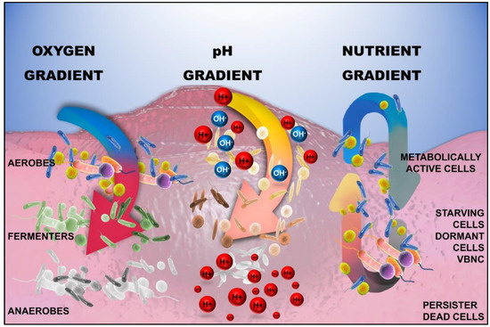 The hydrodynamic flow in the biofilm creates a gradient of resources such as nutrients, pH, and oxygen saturation. These gradients give rise to phenotypic and genotypic heterogeneities within the biofilm [41] (Figure 3). Heterogeneities lead to coexisting microbes lying on a spectrum, including active pathogenic, persister, and viable but not culturable (VBNC) types of cells. Consequently, this increases the challenge of managing biofilm growth by antimicrobials alone.
