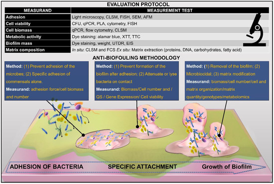 Strategies to combat biofilm development on the surface. Intervention in the material properties can be made to draw an effect at various levels such that it can prevent adhesion and maturation or denatures and kills the constituent microorganism of the biofilm. Each intervention can be objectively analyzed by the corresponding measurands. A detailed analysis of a group of measurands provides a holistic view of the biofilm-resistant mechanism by factoring the different characteristics of the biofilm. See reference [35] for a detailed discussion on measurands and their relation to biofilm characteristics.