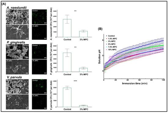 (A) Enhanced resistance to bacterial adherence against early and late colonizers with 3% MPC and (B) trend in the pH changes observed with different percentages of MPC. MPC—2-methacryloyloxyethyl phosphorylcholine. ** p < 0.01, *** p < 0.001. Reproduced with permission from Lee et al. [52]; published by Elsevier, 2019.
