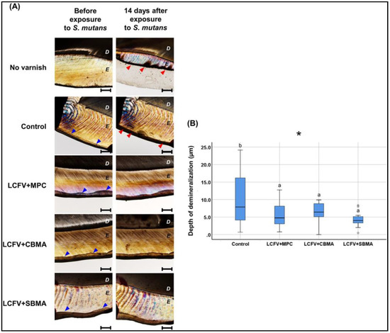 Protective action against demineralization of different polybetaine ZP additions into the fluoride varnish. (A) Polarized light microscopic examination and (B) the corresponding comparison of the depth of demineralization. Difference in the lower case letters indicate a significant difference between the groups. * p < 0.05 [55].
