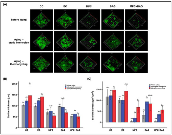 Durable action of MPC added at 3 wt.%, with and without the addition of the bioactive glass (BAG) fillers. (A) Confocal laser scanning microscopic images showing extent of the biofilm; (B) measurement of the biofilm thickness; and (C) biomass at a µm scale. The uppercase and lowercase letters indicate the statistically significant differences within the groups and between groups, respectively at p = 0.001 [57].